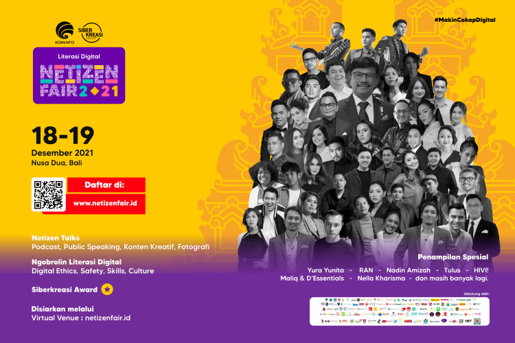 Lebih lanjut, sebagai penutup dari berbagai kegiatan literasi digital yang telah dilaksanakan, di penghujung tahun 2021 ini, Kementerian Kominfo bersama seluruh mitra/jejaring tengah melaksanakan rangkaian acara Literasi Digital yaitu Netizen Fair 2021, yang dilakukan secara serentak dan hybrid di berbagai Kota/Kabupaten pada bulan November 2021 lalu. Puncak rangkaian acara Netizen Fair 2021 ini akan dilaksanakan di Bali pada 18-19 Desember 2021 ini.
