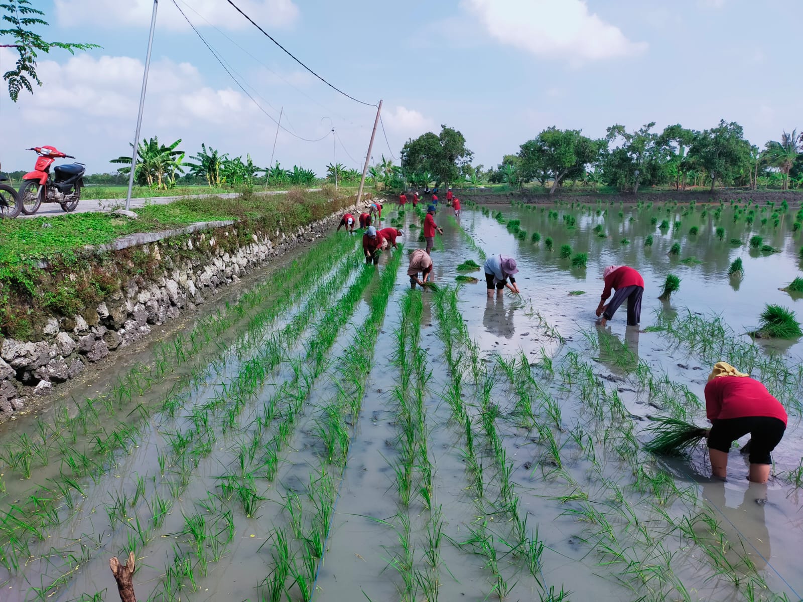 Kegiatan ini diikuti 25 Petani yang terdiri dari 19 petani laki-laki dan 6 petani perempuan. Materi yang diberikan di antaranya praktik tanam padi dengan sistem jajar legowo 2:1 untuk meningkatkan produktifitas padi.