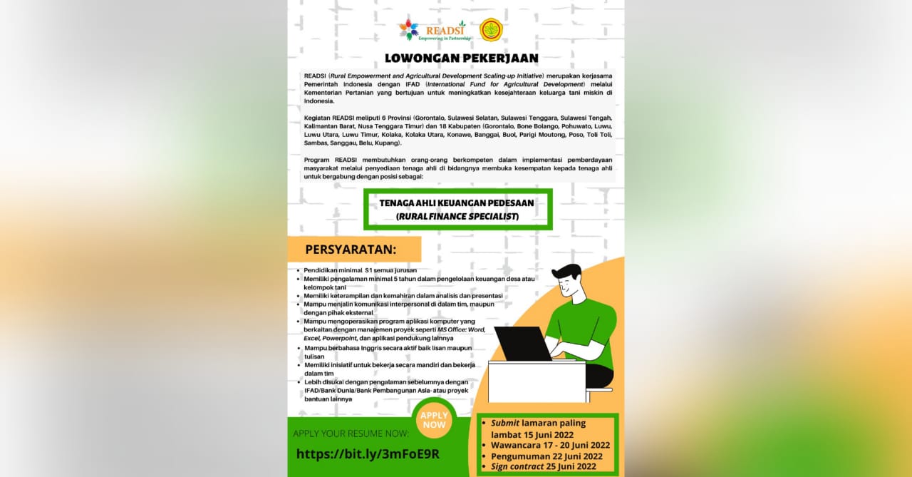 Untuk itu, program READSI membutuhkan tenaga berkompeten dalam implementasi pemberdayaan masyarakat melalui penyediaan tenaga ahli di bidangnya untuk bergabung dengan posisi sebagai :