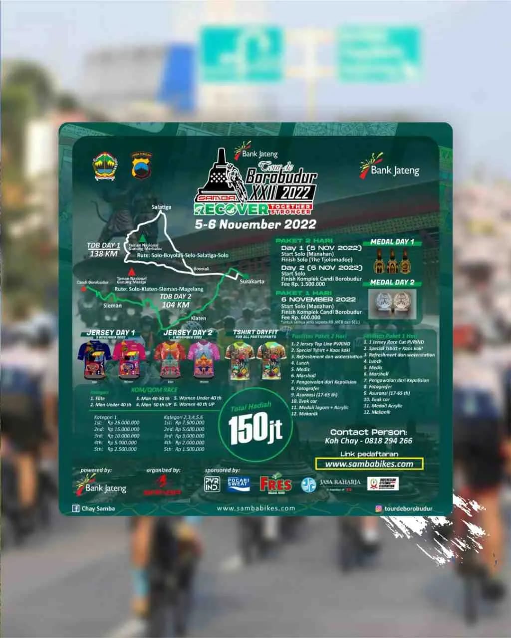 Tour de Borobudur 2022 akan mengambil start dari Stadion Manahan Surakarta hingga finish di Candi Borobudur. Tentu rute ini akan melewati Candi Prambanan yang ada di perbatasan Jogja Jawa Tengah di daerah Prambanan Klaten.